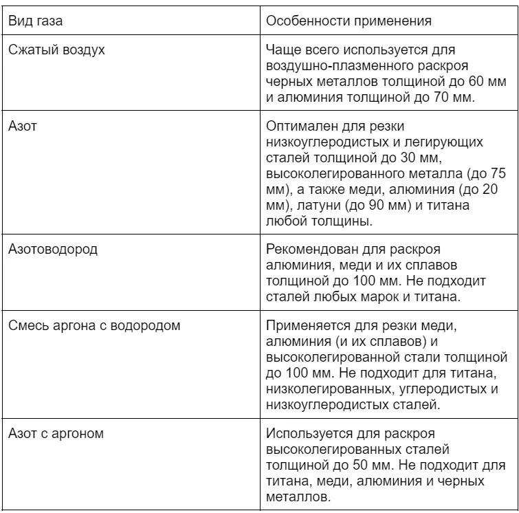 При плазменной резке используются активные и неактивные газы. Выбор зависит от толщины и типа металла. Краткий обзор наиболее распространенных вариантов представлен в таблице.