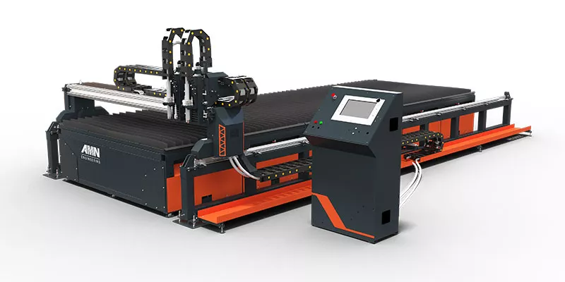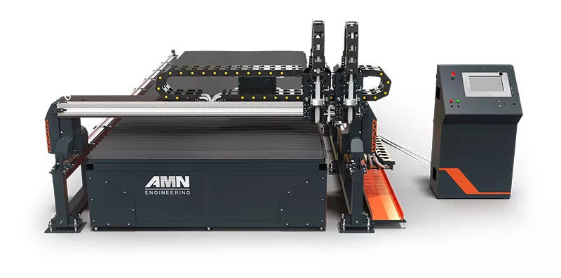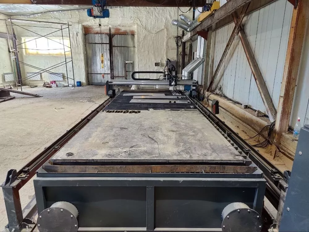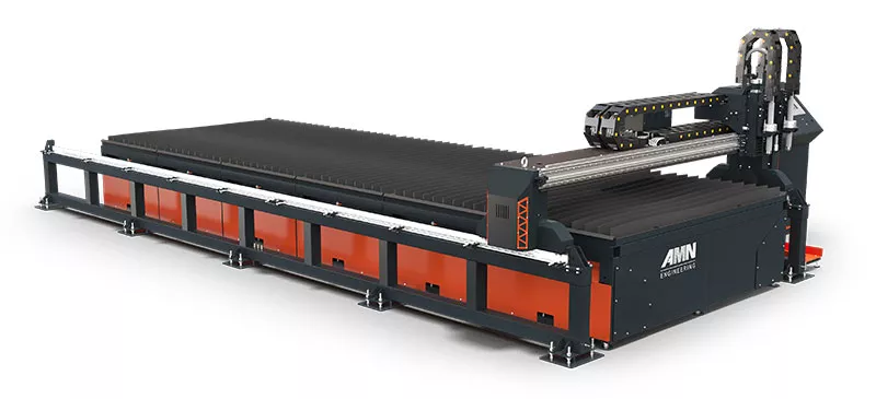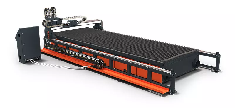 Портал представляет собой металлический каркас со стяжками с 2-мя экструдированными алюминиевыми профилями с высокоточной посадкой под направляющими для снижения подвижной массы. При длине рабочего поля 6 100 мм в стандартном исполнении стол комплектуется 12-тисекционной системой вытяжки газов, которая включается с помощью пневмозаслонки, только когда над ней осуществляется резка. Крупные фракции после резки оседают в специальных шлакобункерах, не засоряя вентилятор. Шлакобункеры с увеличенным объемом сокращают время простоя станка, необходимое для их очистки. Система вытяжки исключает заклинивание штока цилиндра. Ребра станка легко заменяемы. В комплект входят решетки для улавливания мелких деталей.