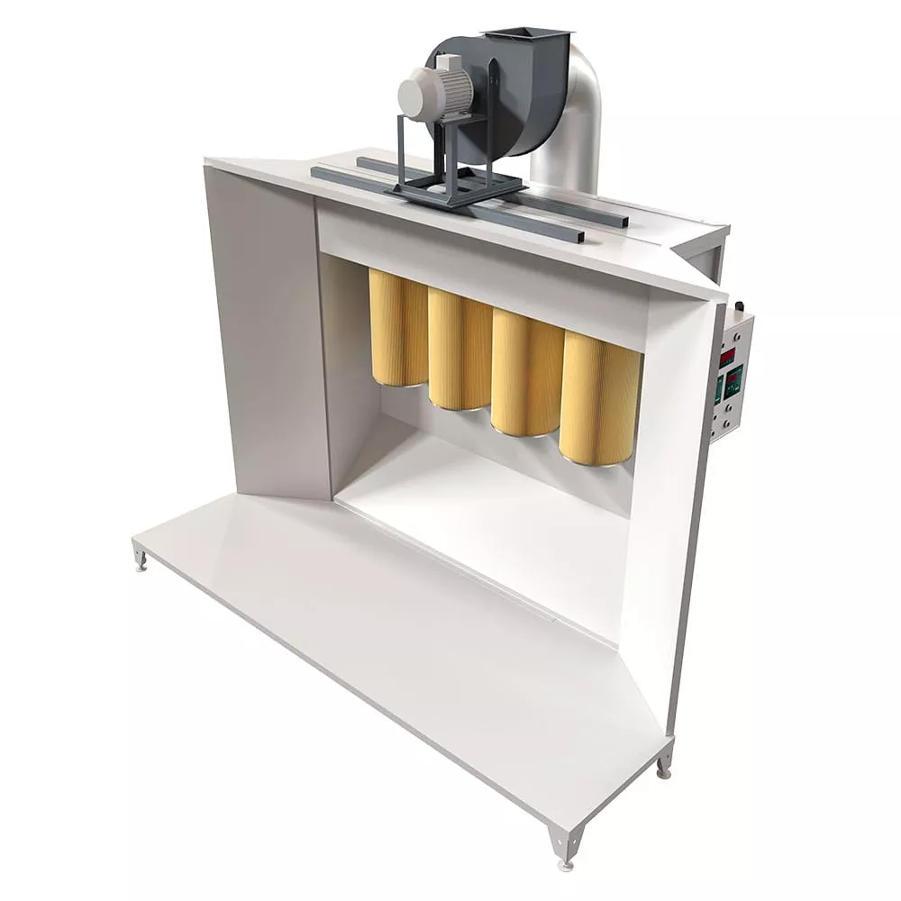 Универсальная камера напыления в большинстве случаев используется на Г-образных линиях. В комплект камеры напыления входит пульт управления, блок картриджных фильтров с импульсной очисткой, вентилятор вытяжки.