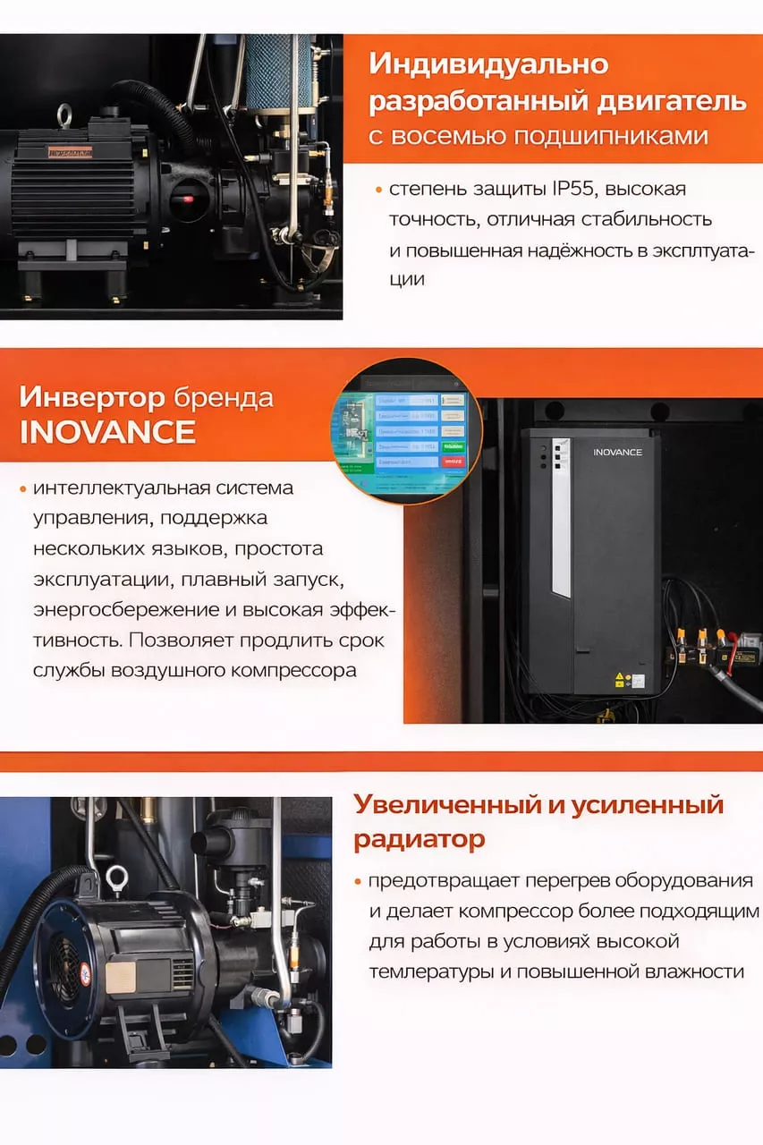 Встроенный осушитель воздуха и система тонкой фильтрации (до 0,01 мкм) позволяют получать сухой и очищенный воздух, что особенно важно для оборудования с повышенными требованиями к качеству сжатого воздуха.
